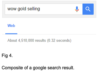 To lead on from the physical economics, and amusement park nature of the experience, an important aspect of the social landscape of WoW is the exploitation of both people, and the game mechanics to provide, outside of the game, an in-game currency black market. Whilst a simple metric for gauging the size of this market, searching for ‘WoW Gold Selling’ at the time of writing returns over four million results, as shown in Fig.4 . Clearly, this aspect of the game is a well-documented phenomenon. In Games of Empire, by Dyer-Witheford and De Peuter, the issue of gold selling was discussed at length. Within the text they make mention that